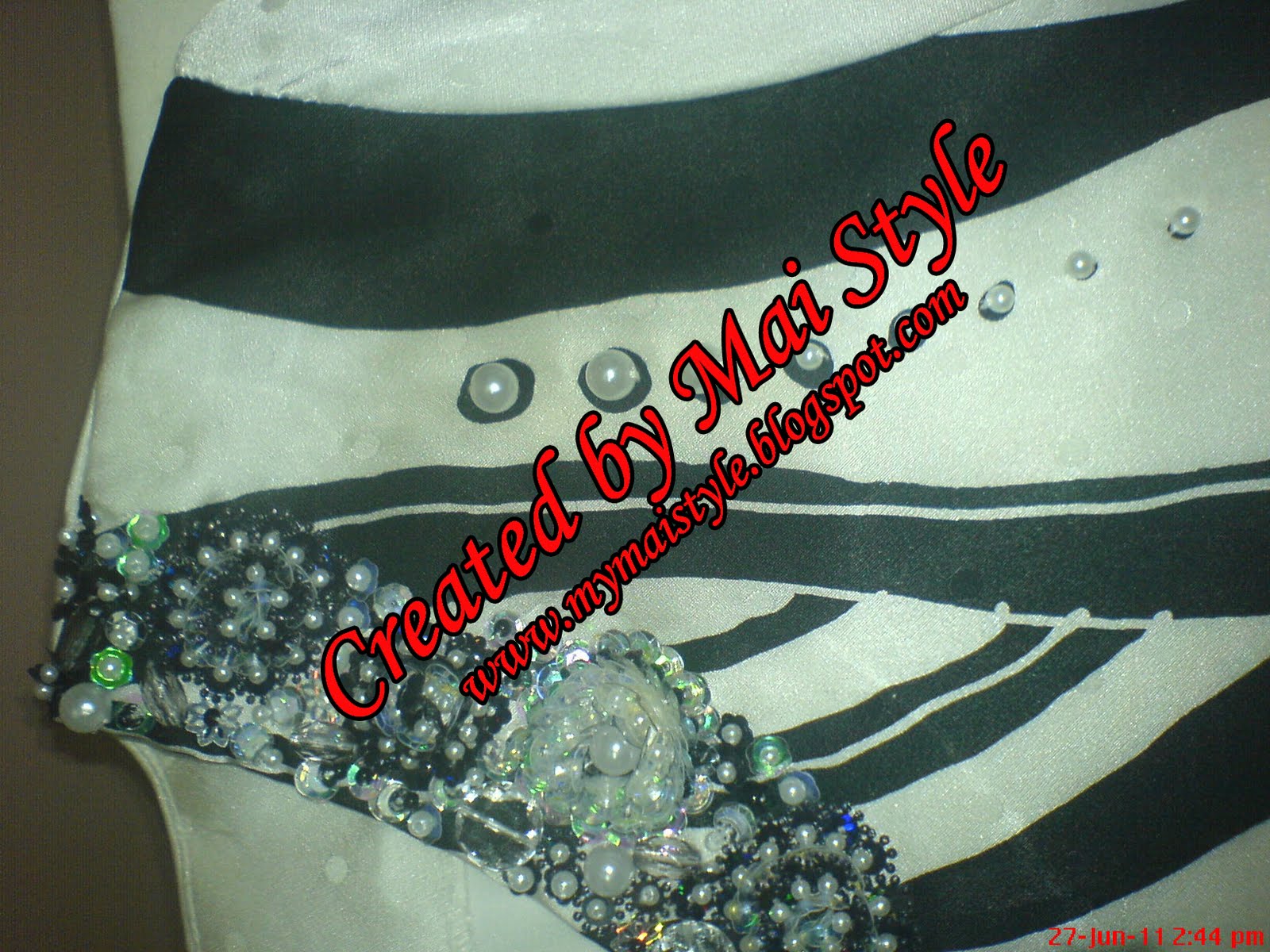 I know now that not everything in life is in black and white…except….in the case of Shin’s mini kurung moden (sutera Terengganu), which then catapults into a case of either my way or take the highway. Apparently, that mini kurung moden is a uniform and with it comes specific rules on beading. I received the parcel with just the dress and was missing one key piece of memo…the guidelines on beading works. Anyway, Shin called soon after and briefed me on the to-dos or rather not-to-dos… But, I somehow misinterpreted or may be misunderstood that spoken memo, and went on to what I usually do best… I was on the right path using black, white, silver and grey colour palette…but I missed the mark by a mile when I added Swavoroski crystals (it’s a big NO-NO). I am supposed to only use pearls, beads and sequins.